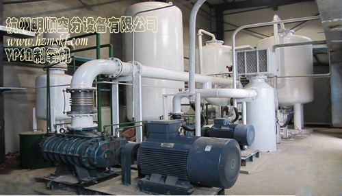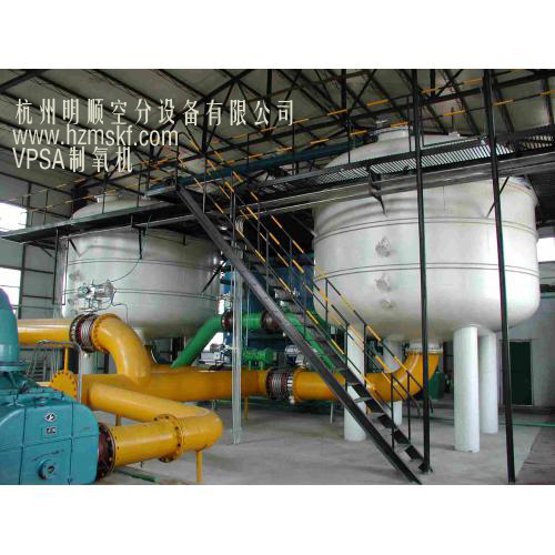 VPSA制氧裝置主要由鼓風(fēng)機(jī)、真空泵、切換閥、吸附器和氧氣平衡罐組成。原料空氣經(jīng)吸入口過濾器除掉灰塵顆粒后,被羅茨鼓風(fēng)機(jī)增壓至0.3-0.5barg而進(jìn)入其中一只吸附器內(nèi)。吸附器內(nèi)裝填吸附劑,其中水分、二氧化碳及少量其它氣體組分在吸附器入口處被裝填于底部的活性氧化鋁所吸附,隨后氮?dú)獗谎b填于活性氧化鋁上部的沸石分子篩所吸附。而氧氣(包括氬氣)為非吸附組分從吸附器頂部出口處作為產(chǎn)品氣排至氧氣平衡罐。